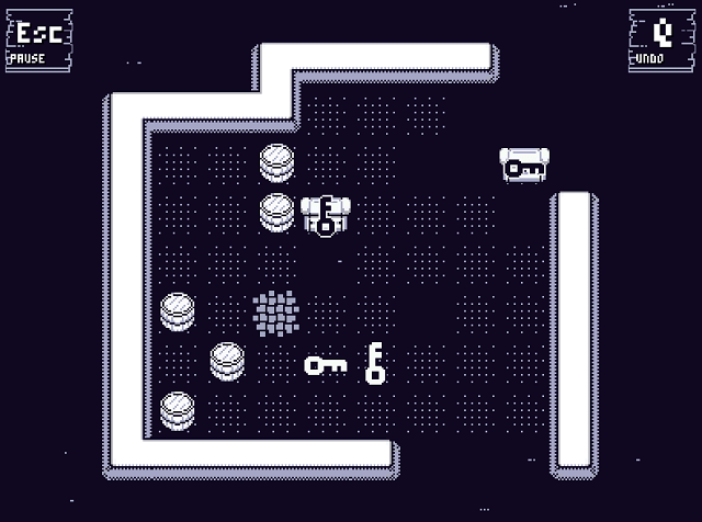 WASD movem, Q volta o último movimento, R reinicia a fase, Esc pausa. Eu não posso dizer que este jogo seja o mais interessante ou inovador que eu já joguei, mas eu gostei de algumas das mecânicas apresentadas, principalmente a de preencher o chão com os barris… Outro fator que vale mencionar é que este treco tem uma trilha sonora absurdamente simplista, mas que eu não sei como, eu gostei. É um treco totalmente repetitivo, mas casa tão bem com o jogo que não me enjoa.