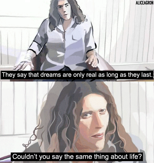 Já Waking Life é uma animação das mais bonitas, com uma estética muito particular e interessante, mas é verborrágica até não conseguir mais. Se passa em um sonho lúcido, onde o protagonista se relaciona com várias pessoas e rola muita filosofia de bar, o meu tipo favorito. Tem algo de motivacional sem ser piegas e acho que, por isso, ainda mantenho minha cópia intacta. A gente nunca sabe quando vai precisar de um empurrãozinho básico em direção à coragem e um afago no coração. O longa também não te leva a nenhuma conclusão específica. E nem tem essa pretensão. É um apanhado de pensamentos, o que você faz com eles, é da sua conta. Não se esqueçam: É um sonho. Vale assistir, ciente do quão atípico ele é. Mas vale.
